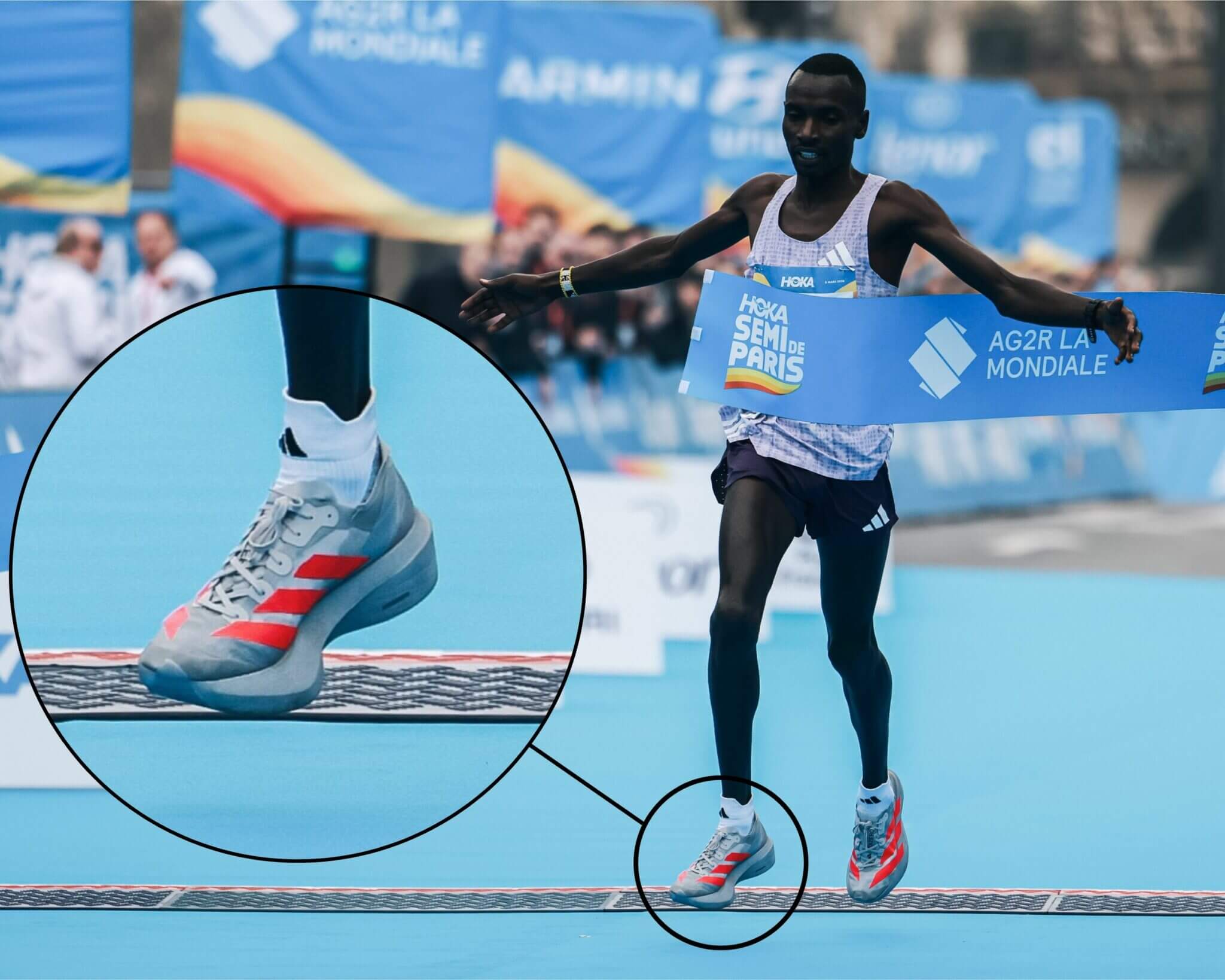 Du côté masculin, le Kenyan Kennedy Kimutai s’est imposé en 1h00’11’’ avec la Adidas Adizero Adios Pro 4. Les deux autres hommes du podium, Timothy Misoi et Thabang Mosiako, portaient également ce modèle équipé des tiges carbone EnergyRods et de la mousse Lightstrike Pro.