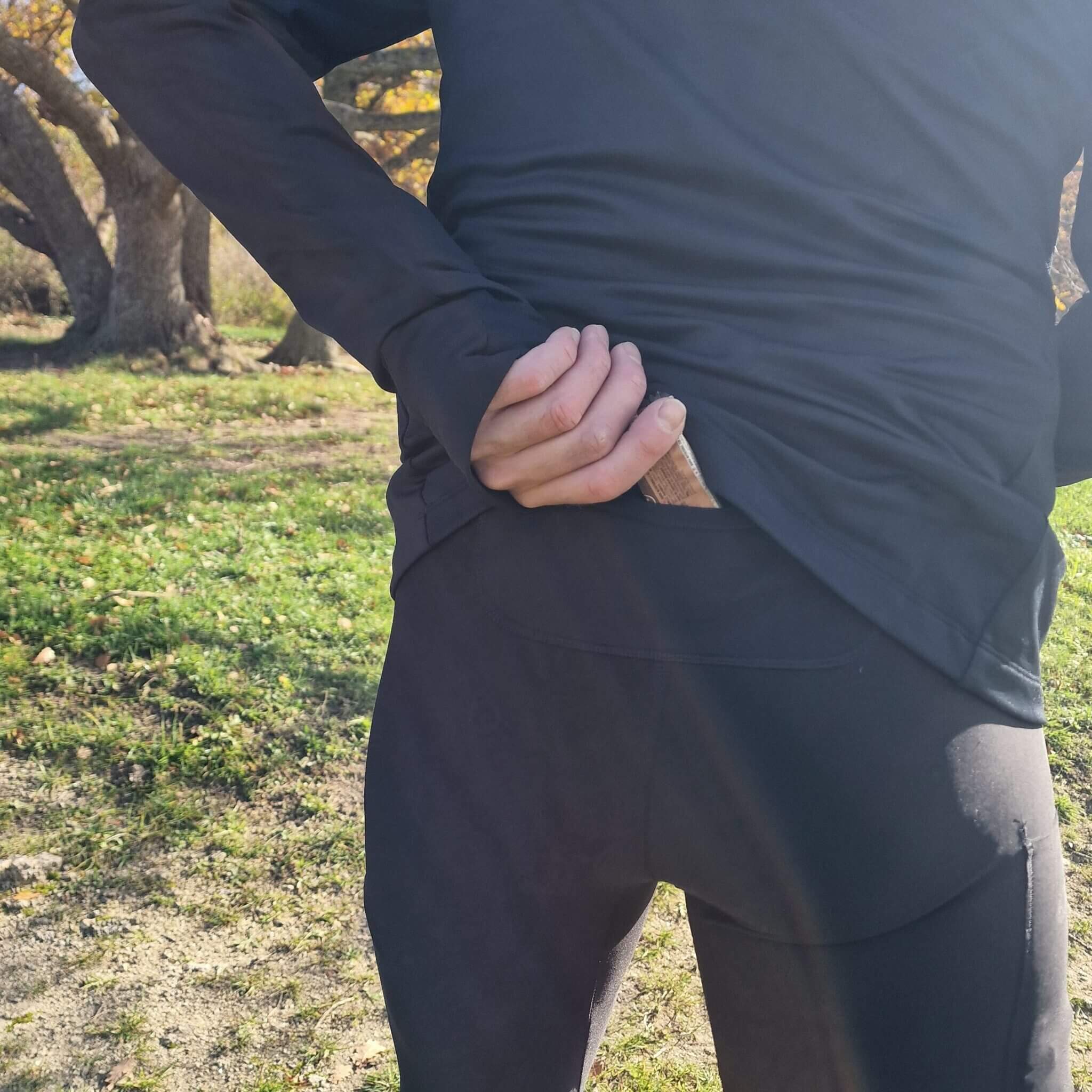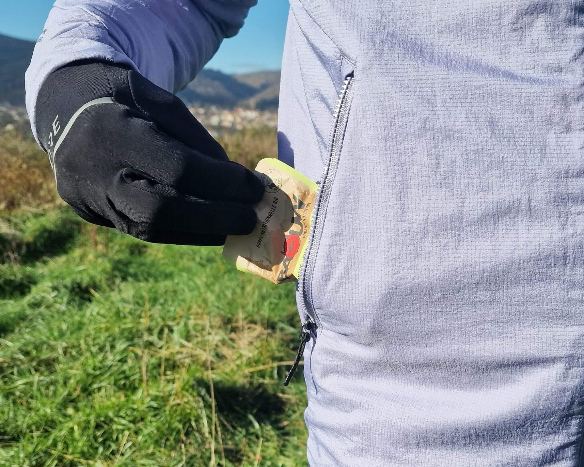 Le zip 1/4 est super pratique : quand je me réchauffe dans les premières minutes, je l’ouvre un peu pour éviter la surchauffe. Et les poches avant me servent soit à réchauffer mes mains avant de démarrer, notamment quand je me rends sur la piste, soit à y ranger mes gants, une barre ou un gel.