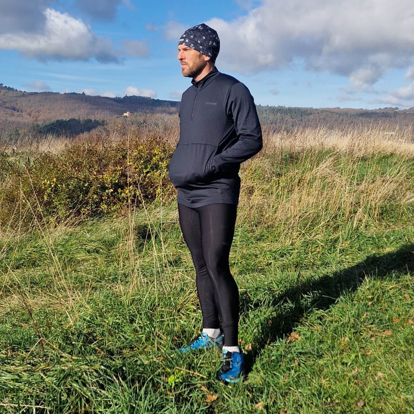 Par-dessus, j’ajoute une couche intermédiaire, et c’est là que j’ai vraiment adopté le haut thermique TRAINING à fermeture 1/4. Cette seconde couche est chaude sans être épaisse, et surtout parce qu’elle reste très respirante. Sa polaire grattée à l’intérieur donne une sensation douce et immédiate, un peu comme un pull confortable que tu n’as pas envie d’enlever. Le pull est long permettant de bien couvrir le bas du dos au niveau des reins.