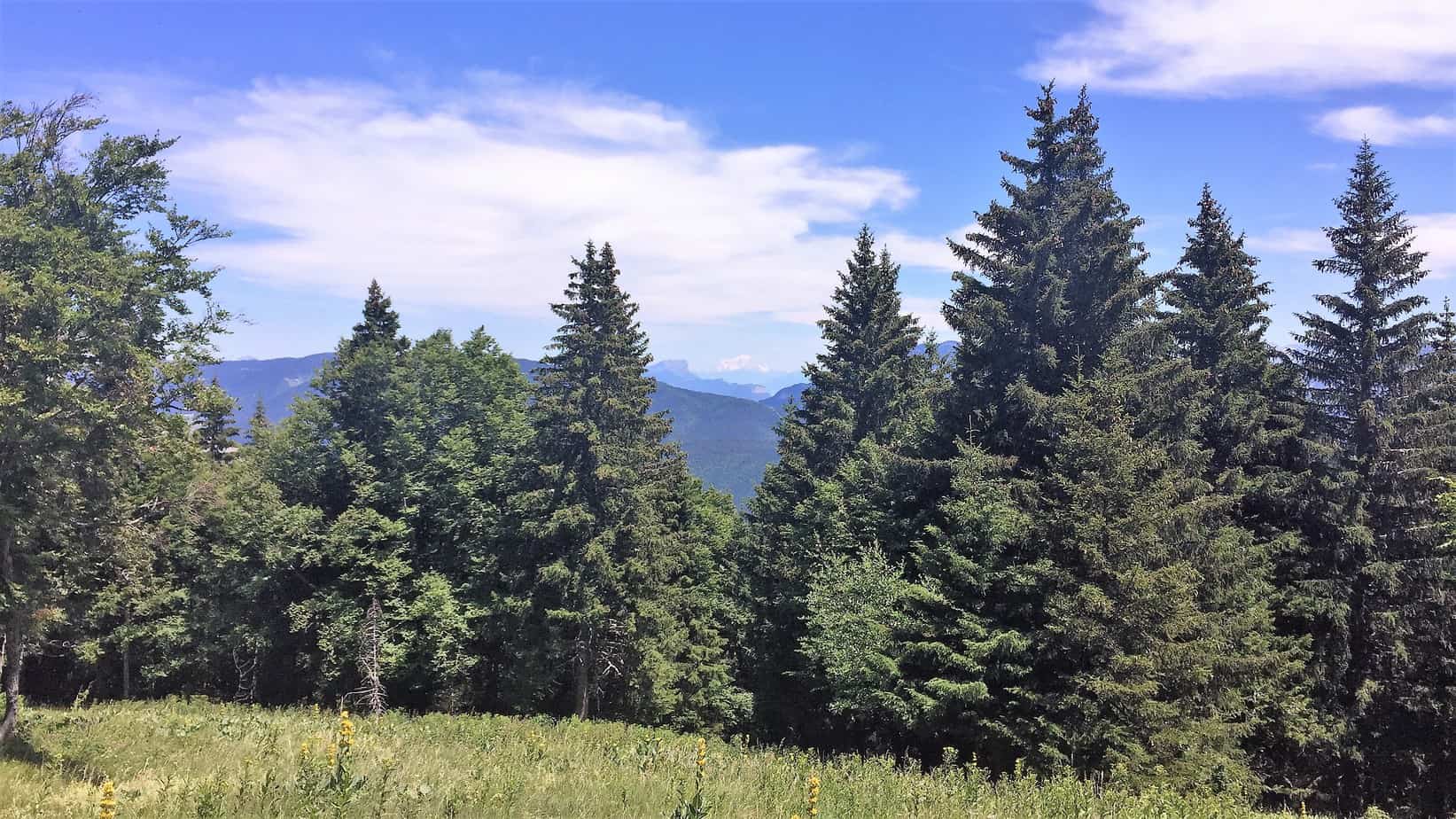 Notre second jour de trail est un nouvelle fois ensoleillé. Après un bon petit-déjeuner, nous troquons nos sacs de voyage contre notre pic-nique du jour à l’accueil de notre hôtel. Il est 8h45 est nous quittons Lans-en-Vercors. Nous devons d’abord emprunter une départementale avant de nous enfoncer dans les bois. Nous nous retrouvons sur un chemin mal entretenu et avançons avec difficulté, jusqu’à ce que nous retrouvions un chemin forestier. Nous devons tout d’abord grimper 700 mètres de dénivelé avant d’arriver sur un passage plus plat qui nous amène au Pas de Bellecombe. Nous sommes en sous-bois depuis le départ et la vue se dégage, offrant une vue en hauteur sur la ville où nous avons passé la nuit.