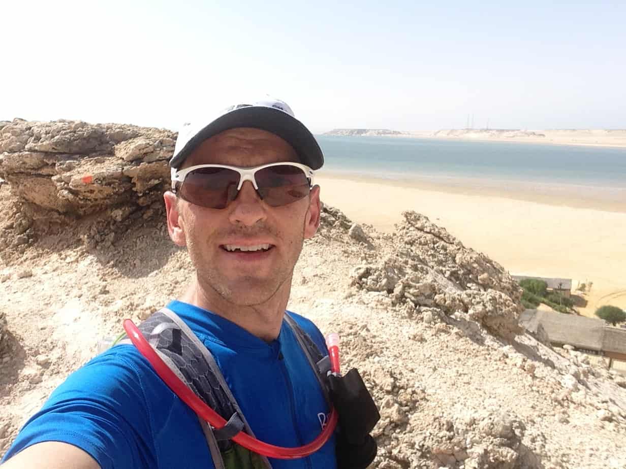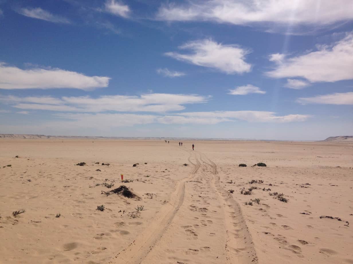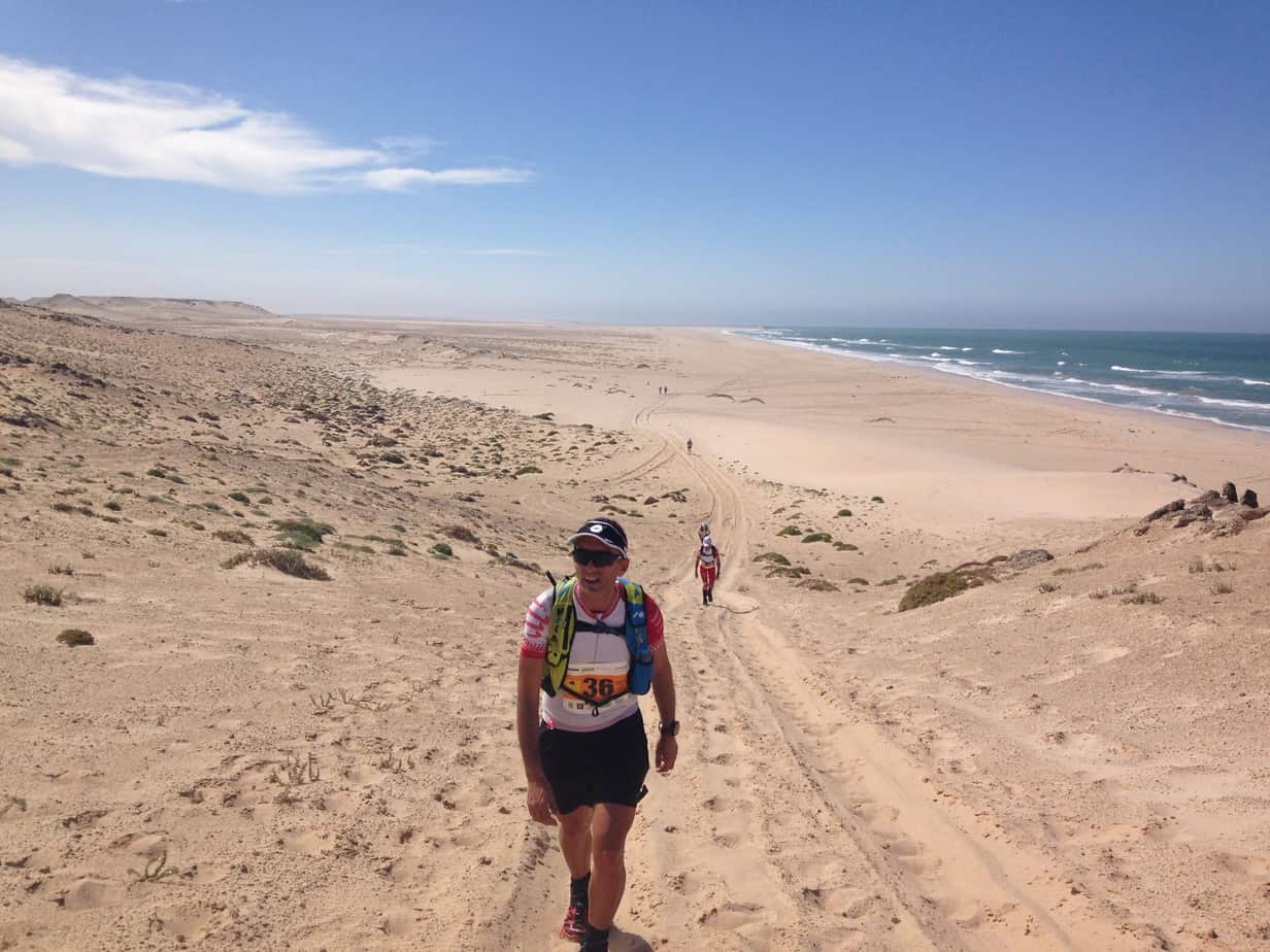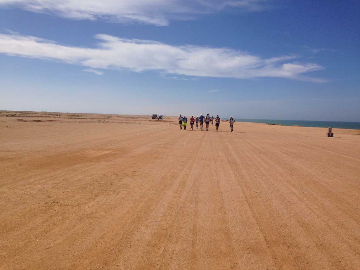 Après 8km de « plage », on retrouve le sol un peu plus dur. Devant, Pierre-Marie a doublé Stéphane et Thomas. Ils ont ralenti, sûrement à cause de la chaleur. Je double d’abord Stéphane, qui s’est mis à marcher, puis Thomas qui semble aussi dans le dur.