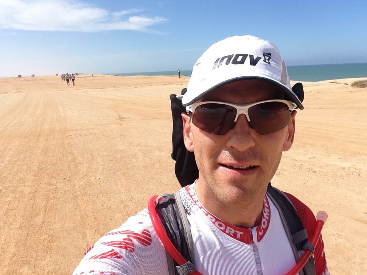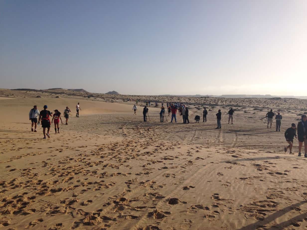 Je passe au premier ravito du KM10. Je prends une bouteille d’eau, puisque que l’étape ne comporte pas beaucoup de sable aujourd’hui, d’après le briefing de course. Mais surprise, c’est du sable mou à perte de vue. Nous cherchons avec Pierre-Marie les balises vertes placées parfois devant la végétation. J’ai l’impression d’être sur une course d’orientation à chercher les balises. Mais finalement, nous ne perdons pas tant de temps que ça, car nous arrivons à bien nous entraider. Très vite, la prétendante au podium part devant moi, me laissant seul pour maudire cette immense étendue de sable. J’évolue à mon rythme en essayant de gaspiller le moins d’énergie possible. Il fait très chaud et je bois beaucoup, m’arrosant régulièrement la tête avec l’eau prise au ravito. Il ne faudrait pas que je prenne un nouveau coup de chaud, comme le jour de la première étape.