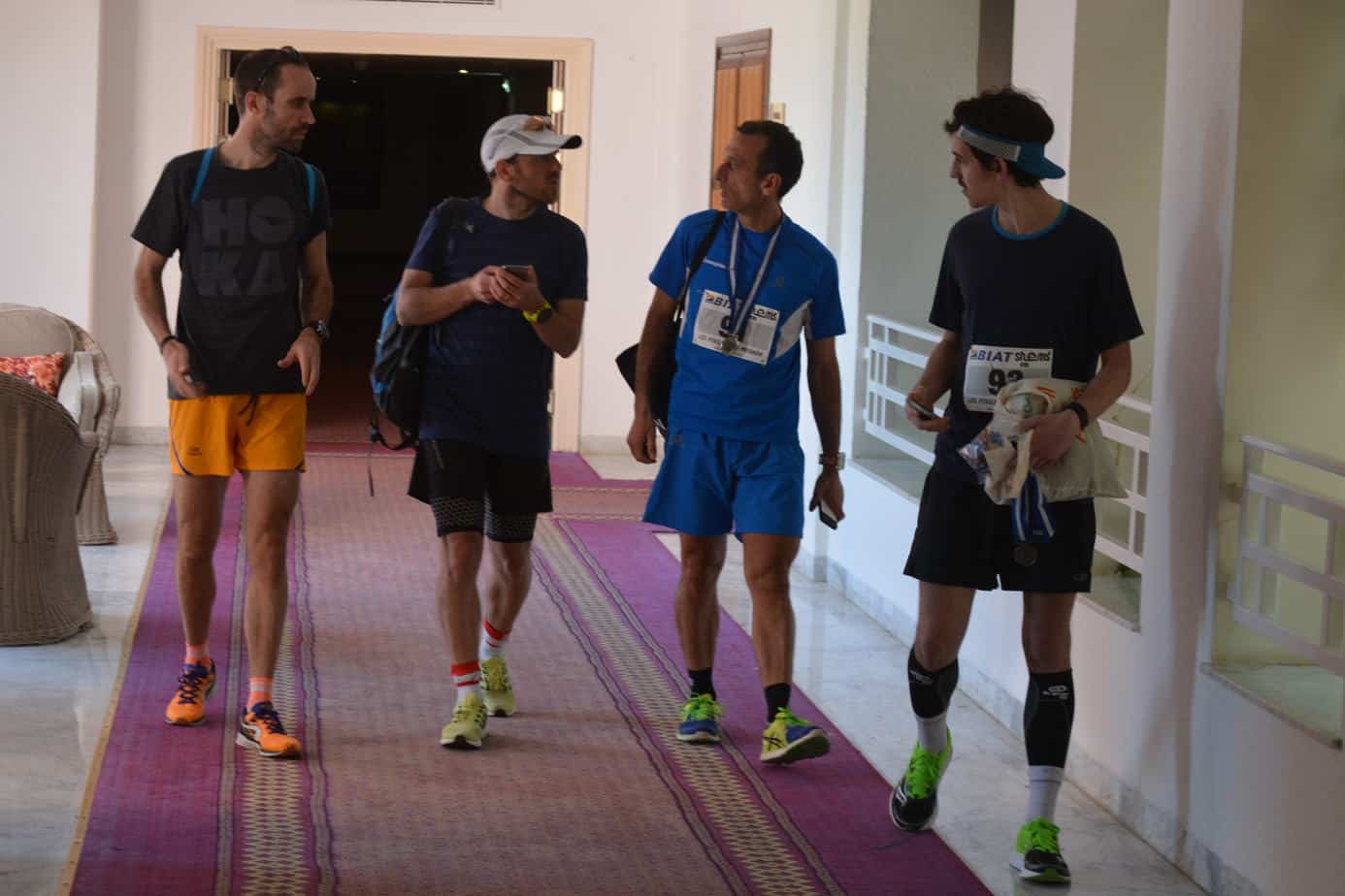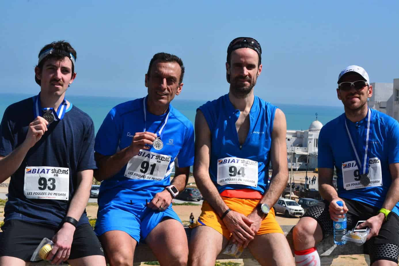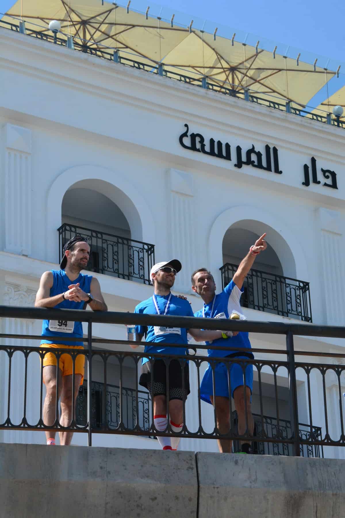 Riadh m’accueille et me félicite. Je me retourne et j’accueille mon partenaire de mi-parcours par une accolade. Pas le temps d’échanger un mot qu’il disparaît aussitôt. Riadh me prend par le bras et me demande si je veux bien répondre à une interview pour la TV tunisienne. J’accepte volontiers. Puis c’est au tour de Philippe, qui arrive 2 minutes après moi. Pendant ce temps, Lionel et Jean-Pierre arrivent ensemble, en un peu moins de 1h32.