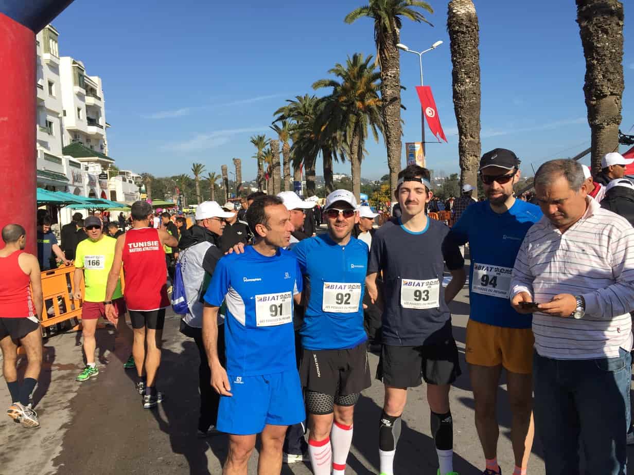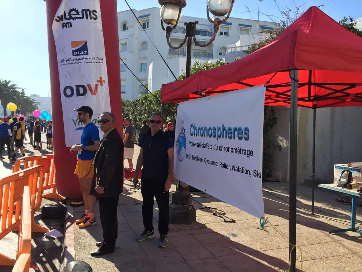 Pendant ce temps, une banderole est tirée en mémoire des victimes de l’attaque terroriste qui eu lieu quelques semaines plus tôt dans le sud tunisien. Avec Philippe, nous nous rendons sur la ligne de départ. Nous avons perdu Jean-Pierre et Lionel. L’hymne national est entonné, voire chanter dans son intégralité. Philippe et moi nous souhaitons une bonne course; le compte-à-rebours est lancé. 5, 4,3, 2, 1…