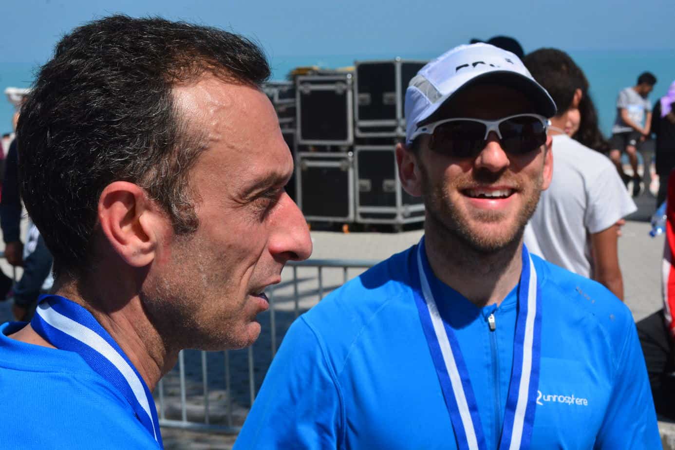 Nous prenons un peu d’eau avant la dernière ascension. Je l’encourage pour qu’il avance. La pente est longue est tout en avançant plusieurs mètres devant lui, je lui crie que c’est bientôt fini, qu’il ne faut rien lâcher. Une fois la pente avalée, je me dis qu’il va pouvoir relancer. Mais il se traîne derrière. Je décide de l’attendre. Une fois qu’il est à ma hauteur, je lui mets la main dans le dos et je le pousse pour le forcer à accélérer. Il reste moins de 800 mètres. Notre accélération est rapide et il perd à nouveau toute énergie. Je lui montre que nous sommes sur la dernière ligne droite, qu’on y est. Et là, il se met à accélérer et à accélérer, me distançant de quelques mètres. Heureusement que j’ai les jambes de feu. J’accélère à nouveau, je reviens à sa hauteur et le passe, tout cela devant une foule en délire, et à presque 22km/h. Je franchis la ligne à la 36ème position, après 1h26min30 de course.