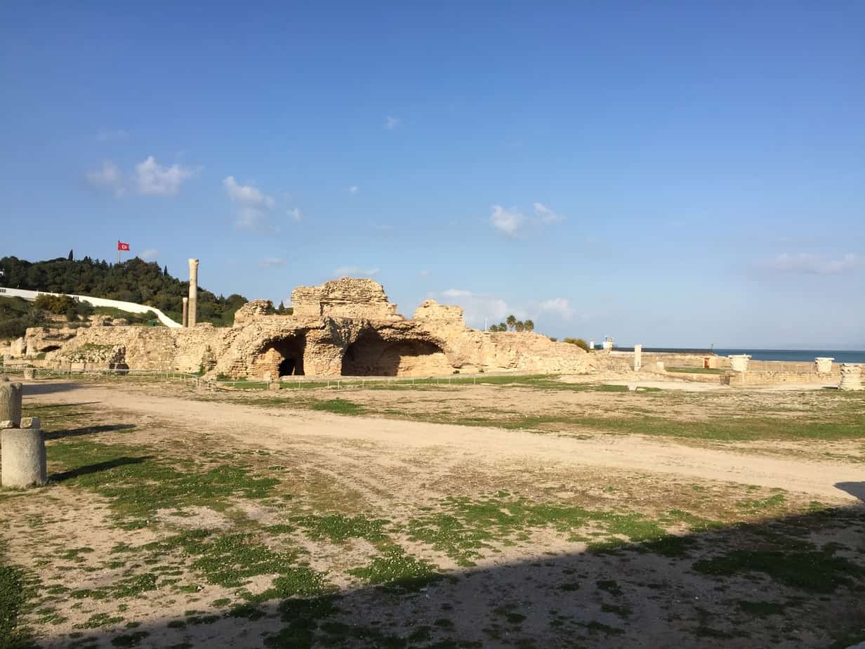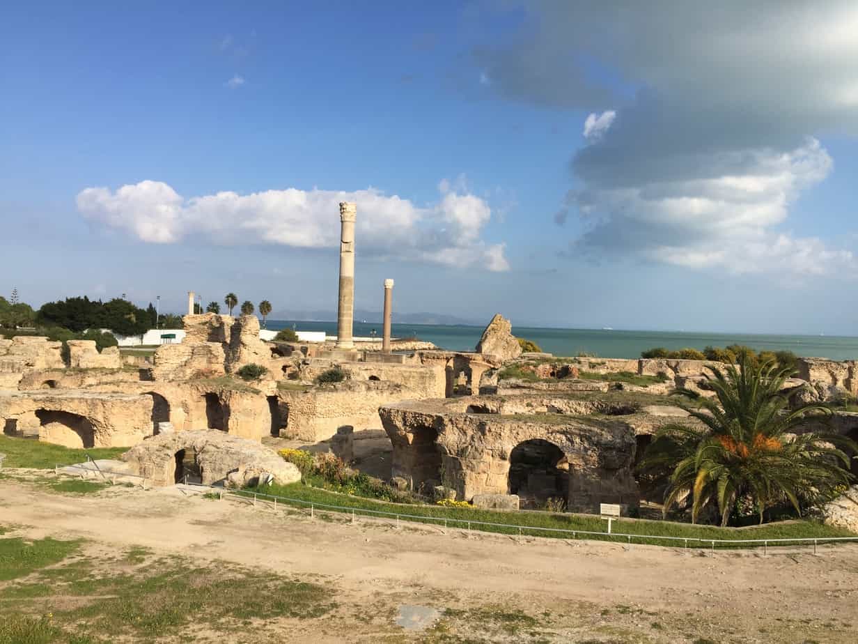 Après deux heures de vol, changement de décor. Le ciel bleu est déchiré par quelques nuages gris, mais sans nul doute, nous sommes bien arrivés en Tunisie. Nous sommes tout de suite accueillis par Nabil, qui sera notre guide pour le séjour. A peine le temps de sortir les lunettes de soleil, que nous arrivons sur le site archéologique de Carthage. Nabil nous fait voyager dans le temps, entre civilisations puniques, romaines, vandales et byzantines. Les ruines de vestiges romains, thermes, théâtres, amphithéâtres… en imposent encore.