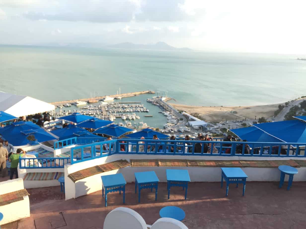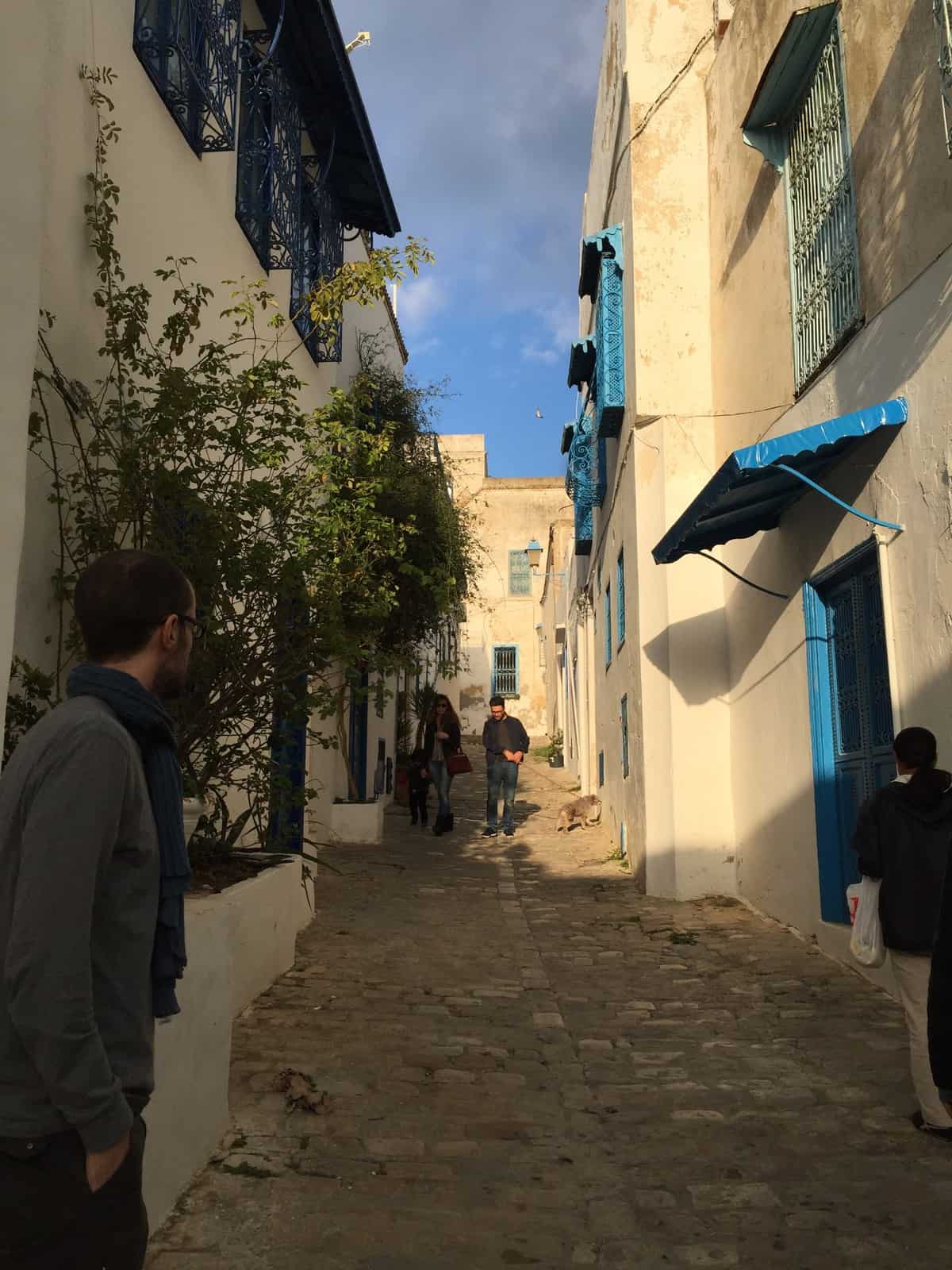 A peine le temps de jouer les touristes et de prendre quelques photos, que nous arpentons les ruelles aux maisons bleues et blanches du village Sidi Bou Said. Le passage devant le Café des Délices nous offre une magnifique vue sur le Golfe de Tunis, laissant notre esprit capturé par le souvenir d’une chanson nostalgique du lieu. Nous passons par le marché, où les vendeurs tunisiens nous abordent pour nous vendre leurs produits. L’échange est calme, pas trop pressant. Les attentats de l’année dernière au Musée du Bardo puis de Sousse ont laissé des traces sur la vie économique et touristique tunisienne, déjà marquée par le printemps arabe amorcé en 2010. Beaucoup de boutiques sont fermées, et les touristes ne se bousculent pas dans les rues étroites du village. Pour nous, cela est plutôt agréable. En tant que touriste, nous sommes bien accueillis, toujours avec attention. C’est plaisant. C’est sûr, visiter la Tunisie en ce moment est des plus agréables, alors que la sécurité n’a rien à envier celle des villes d’Europe.