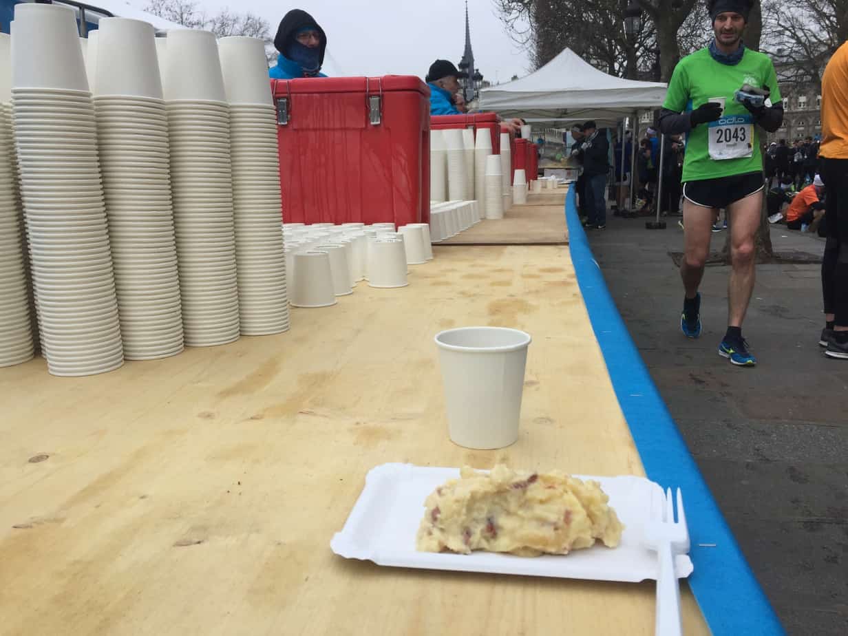 Lui est pressé, impatient de retrouver sa famille. Moi, je goutte à la tartiflette et trempe mes lèvres dans le vin chaud. Mais ce ne serait pas cohérent par rapport à la fenêtre métabolique. Un peu de pain d’épices et une pomme feront l’affaire. Je retourne à l’espace VIP où il fait meilleur. Je discute un peu avec les coureurs déjà présents, avant de rentrer chez moi par un footing de décrassage.